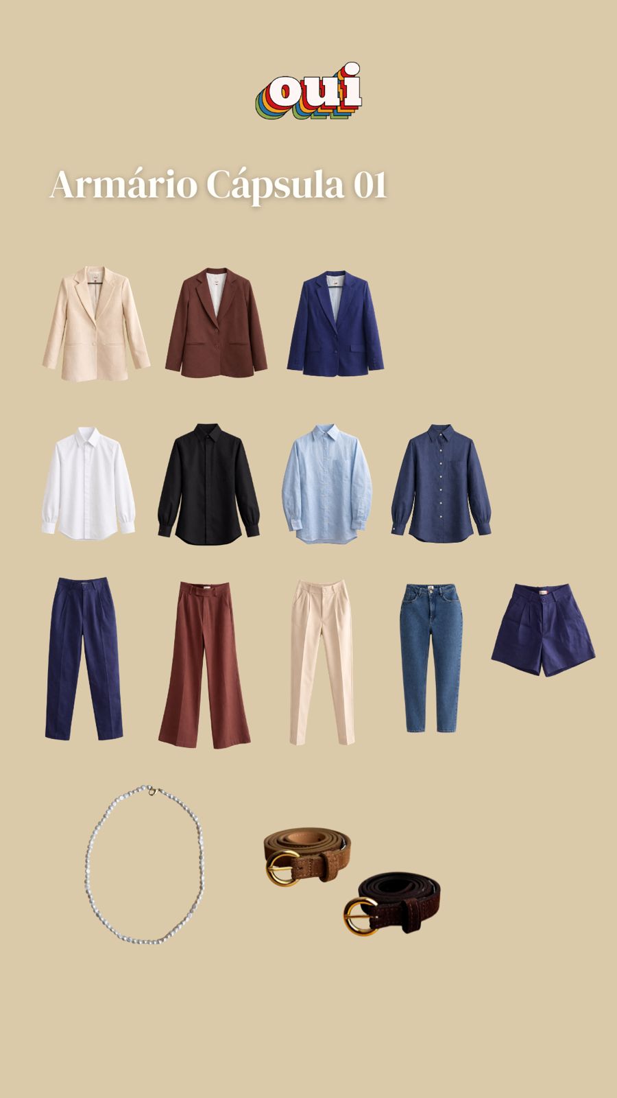 O Armário Cápsula foi criado para quem quer estar sempre bem arrumada sem precisar pensar muito na hora de montar um look. Reunimos 15 peças cuidadosamente escolhidas que combinam perfeitamente entre si: 4 camisas, 3 blazers, 4 calças, 1 short, 2 cintos e 1 colar.