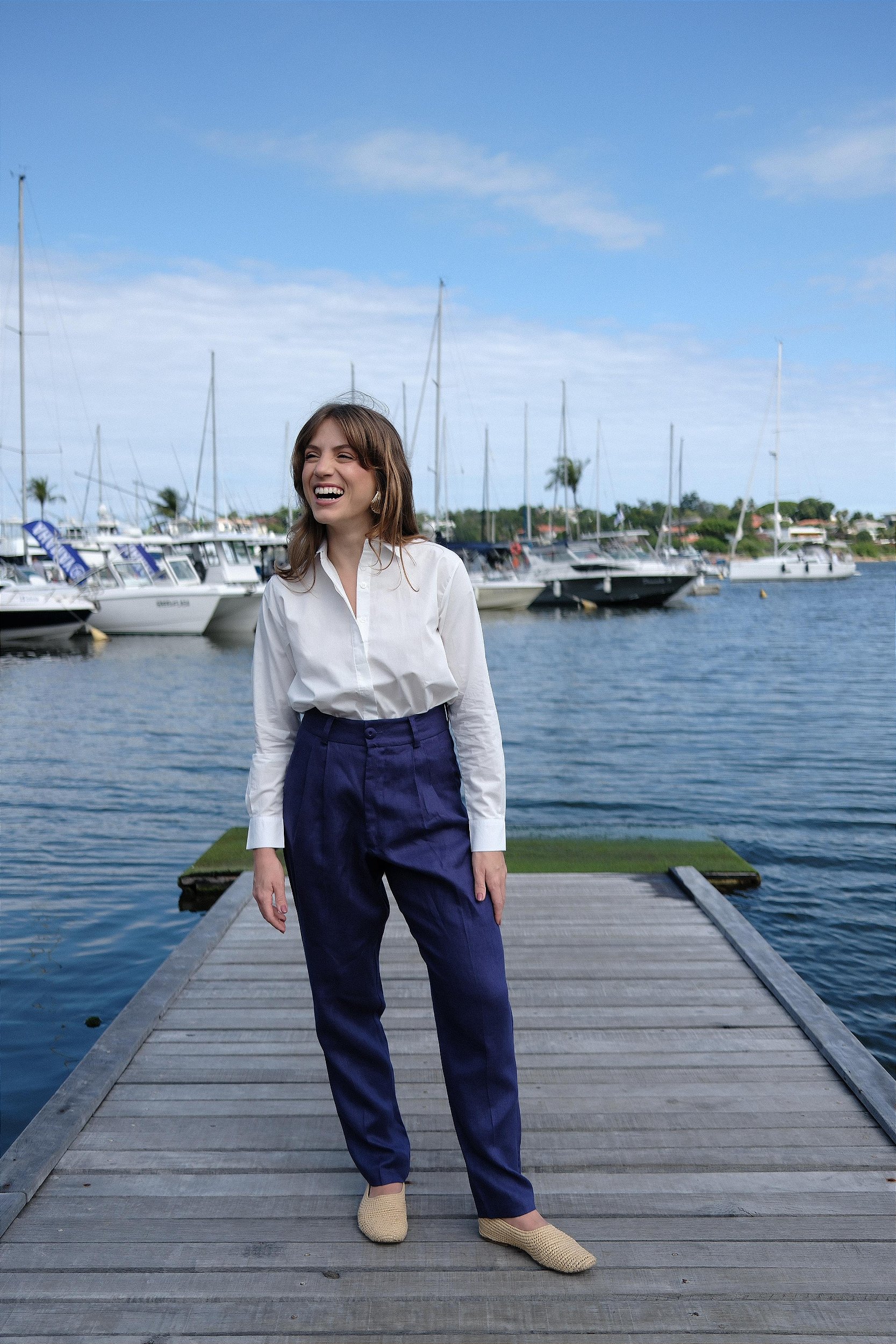 O marinho traz profundidade e elegância à calça de linho, criando uma peça versátil e fácil de usar. Clássica, mas longe do óbvio, ela transita bem entre produções mais formais e combinações descomplicadas, sempre com um ar sofisticado.