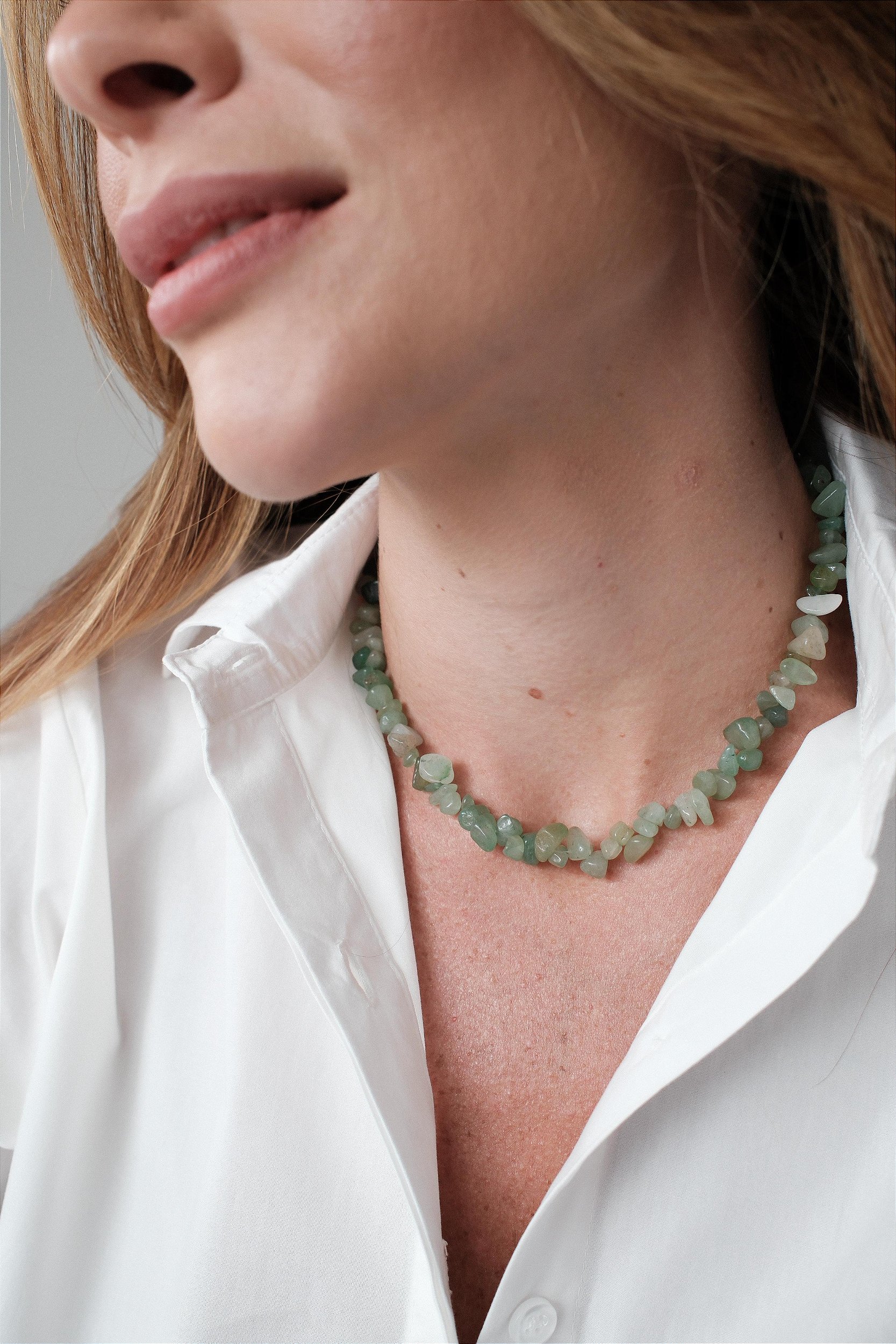 Um colar de quartzo verde tem um ar descolado, perfeito para usar sozinho ou compor mix de colares! Dá um toque jovem, moderno e cheio de estilo! Esse tom de verde está especialmente charmoso.